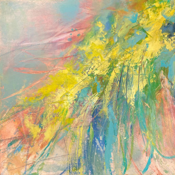 Oil & mixed media painting on a cradled panel with off white painted sides. Sealed and finished with wax and sold ready to hang.